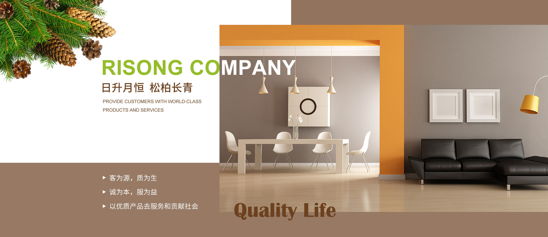 大連日松將一直秉承“以優(yōu)質(zhì)產(chǎn)品去服務(wù)和貢獻(xiàn)社會(huì)”的經(jīng)營(yíng)宗旨;“客為源,質(zhì)為生、誠為本、服為益”的經(jīng)營(yíng)理念;達(dá)到“使用者、銷售者、制造者”三者并存共榮之經(jīng)營(yíng)思路;全體日松人將以“熱情、禮貌、快捷、準(zhǔn)確”的行動(dòng)指南,不懈努力的為每一位客戶,提供行業(yè)內(nèi)一流的高端、環(huán)保、舒適、健康的產(chǎn)品和細(xì)節(jié)服務(wù),打造出適合“您”的優(yōu)質(zhì)家居住宅環(huán)境。